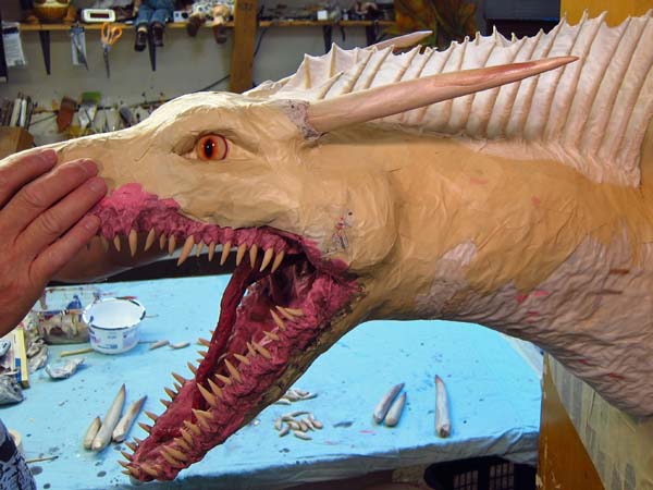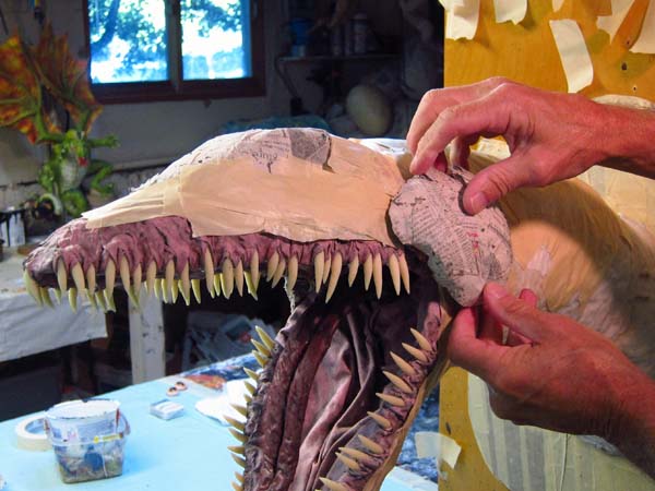 Hi everyone. Well, I’ve been very busy. But I got some work done on Drogon. In the last post I added the jaws. As always, I used paper mache shells to build the face. I cut off a large piece from a paper mache ball and put it on the top of the head. Then I used another piece of shell to fill in some gaps. And I used more pieces to add some bulk to the back of the jaws.
