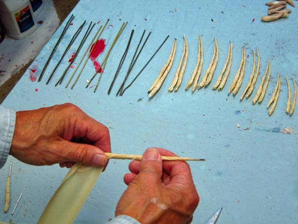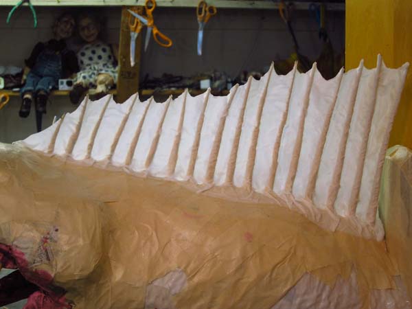 I wanted some webbed spines. In fact, I wanted a pair of them running parallel to each other down the neck. The Drogon in “The Game of Thrones” TV series had dual, webbed spines just like this. I made the spines by twisting paper around pieces of wire clothes hangers and wrapping them with masking tape. I poked holes along the neck with an ice pick for the spines.