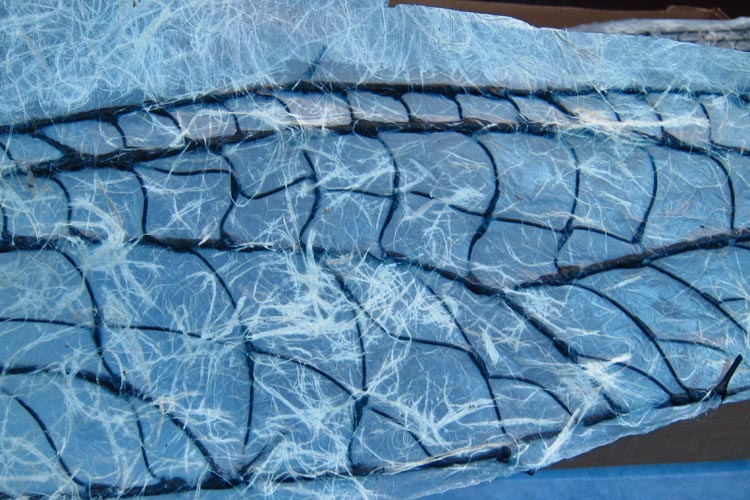 So I went to a fancy pants paper store close to where I live. I found this tissue paper that has little strands of cloth in it. I really like it. It’s light. It shows off the structure of the wings. And it is just more organic.