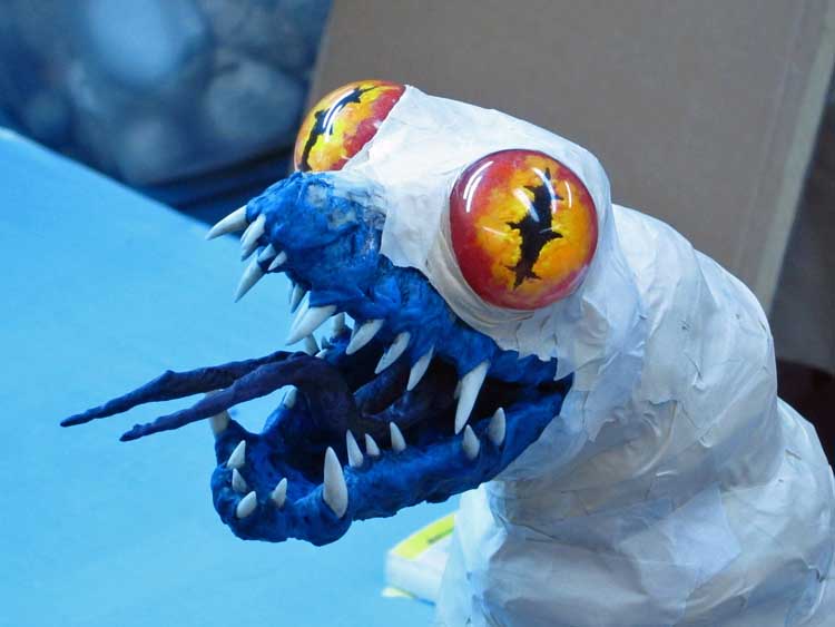 Here it is from the side after everything was assembled and most of the cloth mache skin was added.   But I’ll tell you, I just hated the eyes.   It’s not rational.   It was all bug.  No dragon.  Which then made the neck seem odd.  I was ready to put it out with the trash (my garbage collectors might have gotten a kick out of it).  By the way, I will fix that bump where the wings stick out.  I will build it up between the neck and the top of the wings to make a better transition between the two.
