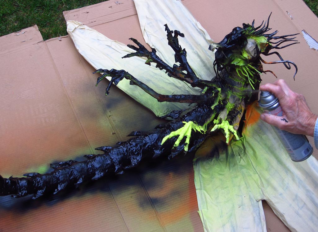 So…. painting.  I don’t usually use spray paint, but this project called for it.   I masked off the Fimo spikes, the eyes, teeth, and wings, took it into the back yard, and spray painted the back side orange.