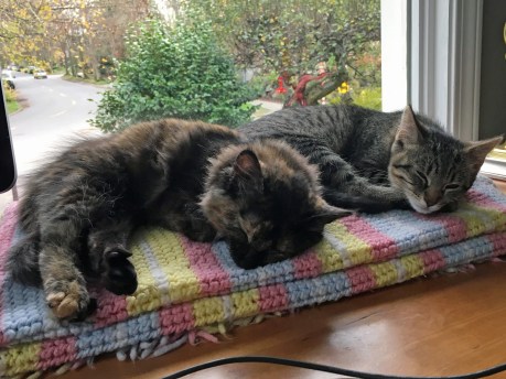 Meanwhile, since I posted last, we picked up two new “helpers.”   I’ll use this same photo to introduce them.   The “torty” in the middle is Mazzy.  The little tabby on the right is Abby.  We got them on the same day from different shelters.   As you all know, my beloved Max died last year after a long, baffling illness.   Then, two weeks after Max died Eddy quit eating.   We are convinced that Max’s death contributed to the onset of Eddie’s illness.   Eddy just missed his friend and tormentor.   After a lot of work, and lots of vet bills, Eddie is now relatively healthy again.   Much of the reason we got the kittens was to give Eddie some company.   And he has really responded well to them.     And so have I.