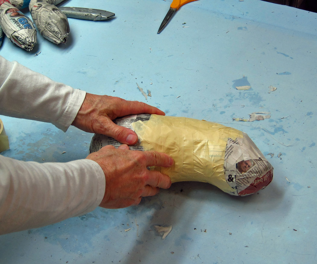 I started with the back legs.  I cut holes for the legs and inserted the backs of the legs into the holes.  Then added masking tape.