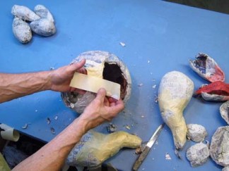 Now I have two hind legs ready to go.   Next, I cut two fairly large holes in the body for these legs.   I break the shell in between so that I can pull out the big wad of paper inside.  Again, I wrap that wad of paper with tape and throw it into a box.   Then I have ready made wads of paper to mache for later projects.   It’s a really nice system I think.