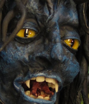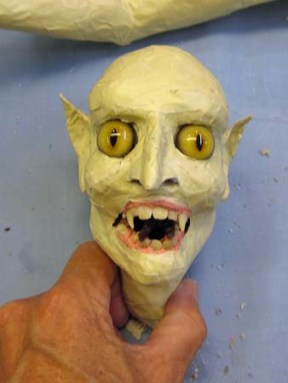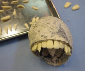 As usual, I cut the paper mache ball in half. I made some teeth out of Fimo and hot glued them onto the shell.