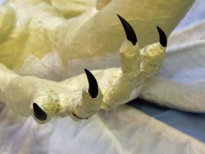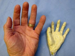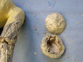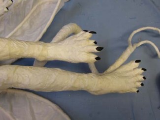 Now I know what you are thinking. I shouldn’t have modeled her hands after mine. She’s long and thin. My hands would look too wide. And they did. So I cut them off and made them thinner. I just cut out some slices between the fingers and squished the hand back together. This is as close to surgery as you get in the paper mache world. I made the feet the same way I made the hands. But this time I made the feet longer proportionally than my own.