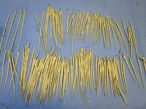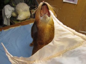 Here she is with the cloth draped over the spines. I let this cloth dry over night. On the right you’ll see Eddie complaining. He wanted me to stop working on the butterfly and to give him food.