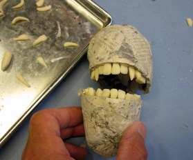 I made a tongue the usual way. Here is what they look like together. Don’t worry, I’ll cut away some of the paper mache shell on the bottom. The lower jaw won’t look like that.