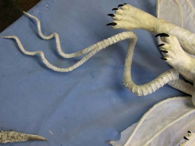 As you can see below I attached her scary head. I know, she still looks creepy. As I said earlier, this will change radically when she has lips and eyelids and hair (well, the equivalent of hair). You’ll notice I also added breasts. Max was curious about these. She will have scales when she’s finished. That will change how you perceive her anatomy. On the right you can see the beginnings of her wings. You can also see her fingers and toes in the upper right hand corner of the photo.