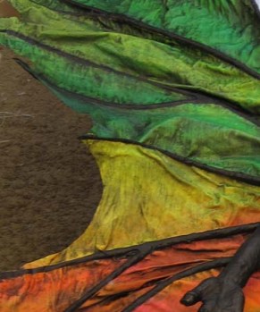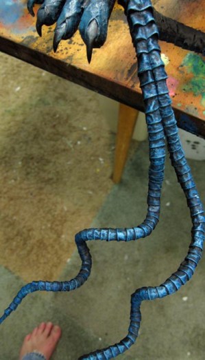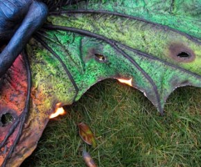There is always a tendency at this point to want to resist blackwashing, to preserve the bright colors. Many people who use my paper mache techniques simply can’t bring themselves to add black paint at this point. They get severely attached to how pretty the colors are. But it’s necessary. The black brings out the colors. On the left you can see part of a wing after I blackwashed. It looks so much better! Now I did something kind of fun on this project. Not only did I blackwash the project, but I also splattered it with black paint afterwards. Then I used a blow torch to burn holes in the wings and to singe the edges. It was fun until I almost lost the project. I didn’t realize that the underside of the left wing was still burning when I lit the right side. Luckily where there is fire, there is smoke. I caught the extra fire just in time and was able to extinguish it. That would have been a real bummer (as I used to say in the 60s)(okay, so I still say it all the time) if I’d done all that work only to watch her go up in smoke, literally.