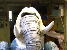 Here is where the trouble started. I knew that I would need a hole at the top of the trunk. The base of the trunk needed to swing back into the head as the trunk was raised. I thought that I could sculpt the rest of the face around that hole. Well I couldn’t. After placing the eyes all over the head I realized that they needed to be directly above the trunk to get the face I wanted. When I did that, the hole looked like a little mouth. No matter what variation I tried it just looked terrible. I had to decide between artistic integrity and having the trunk move. In the end, there wasn’t really a choice. I needed the elephant to look the way I envisioned from the beginning no matter what. So I abandoned the idea of the trunk swinging with the arms. It ended up being just fine. Having only the legs of the elephant move was consistent with having just the hind legs of the donkey swing. And as you can see the elephant’s face looks much better without the hole.