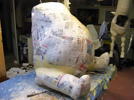 The body of the donkey was much more manageable. I needed probably 10 crumpled balls taped together into an elongated body for this piece. This next shot was taken the day after after I added the paper mache to the bodies. I inserted a long threaded bar through the elephant. That way I could hang the giant ball and let it dry from all sides at once. I don’t like sitting such a heavy piece on a flat surface when it is first wet. There is a tendency for a big wad of wet paper like this to compress and change shape.