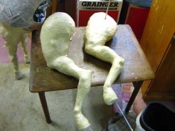 I finally attached the hind legs. As you can see I had to take out more of the wadded paper in the hind quarters (that I’ll re-paper mache later for another project). I used pipe clamps to connect the two legs to each other inside the body. Then I patched the hole in the belly.