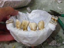 Then I did my usual sculpting with various paper mache balls and pieces of balls, and of course, lots of masking tape. Note the bar sticking out at the thigh level. The leg will pivot on that bar.Below is the donkey hanging from the ceiling for the first time. It hangs from a three-eighths inch threaded bar that extends through the body to the chest. I’ve sculpted the front legs. And I’ve finished the cloth mache on the donkey jaws. Note the horse teeth. Thank you Mona!