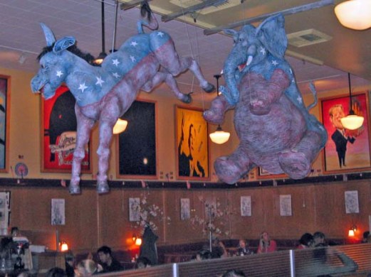 Taking photos of my paper mache is always hard. They never do the pieces justice. It was very difficult getting good shots from inside the restaurant. But I think you can see the pieces pretty well. As I mentioned before, when someone opens the blue front door, the donkey kicks his hind legs. When the red front door is opened, the elephant throws up his front legs. In the end they worked perfectly. And I am very happy with how they look. I am very proud of the fact that I made these in three short weeks. I don’t recommend it. I actually had the hair dryer out at times trying to dry some pieces.