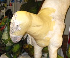 I inserted the jaws. Note that I’d already painted them. I used the shell of another ball to make donkey ears and I added eyes. After that I cloth mached the face. Okay, I know what you are thinking….. this looks like the donkey in Shrek, right? You almost expect to hear Eddie Murphy’s voice. I really hated it. In my next entry I’ll show you how I tweaked the features to make it less Shrekkish.