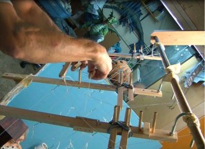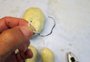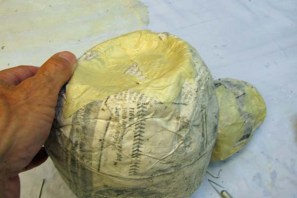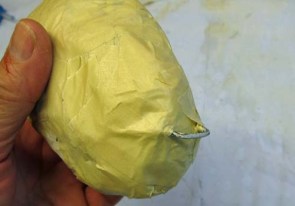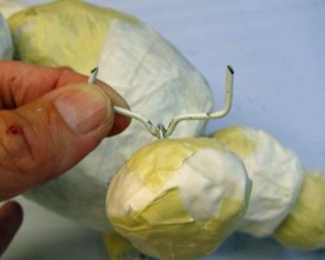 At this point I must point out that I am not a puppeteer. I did make a couple of marionettes for my “Paper Mache Dragon Marionette” video, so I learned a few things. Articulation is everything. Duh! Puppets have to move well or they don’t work. I used pieces of wire clothes hangers to hold the various parts and appendages together. The first thing I did was punch in the ends of the paper mache balls to create cavities (photo on the left). This ball was the dragon’s torso. It’s hard to explain, so just look at the shape I bent the wire into. I punched the bent ends of the wire into the balls and used masking tape to hold them in place. Once I cloth mached (yep, did it again) the parts, these wire pieces stayed put.