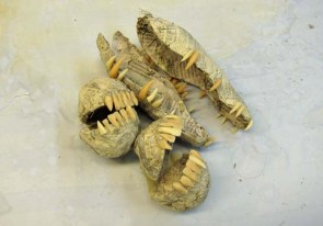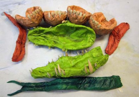 As usual I made jaws out of the shells of paper mache balls. I made a set for all of the characters. The dragon’s are the elongated ones. I made the teeth out of Fimo and then attached them with hot glue.