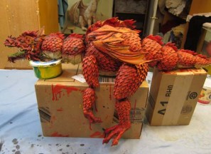 I finished adding the cloth mache to the rest of the head. I also put a few small scales on the nose. Likewise, I added scales over the rest of the dragon’s body. Yes, this takes a lot of time. But it is worth it I think.