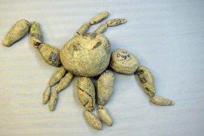 To begin. Here is the pile of crumpled body parts I started with. Of course I paper mached them all (yes, I know “mached” is a made up word. “Mache” is a noun and isn’t supposed to be used to make a verb. You don’t need to tell me anymore. I heard you (you know who you are). I’m just ignoring you.)(Remember, I was a math major, not a language major.).
