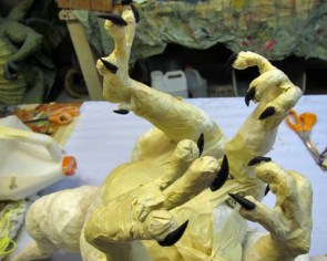 Anyway, back to the making of the central character in the video, the little dragon marionette. This is a bit more of what I started last time, the assembly of the body. As I showed you last time, I used pieces of wire clothes hanger to connect the segments. I left off with the tail. As you can see below on the left, I put together two segments of the neck. I know, it doesn’t look all that different than the tail. It will look more like a neck once I put a head on it. On the right you’ll notice that I added some cloth mache between the segments. I wanted them to stay together as I assembled the rest of the puppet. You can see the elongated paper mache balls I will use for the legs underneath.