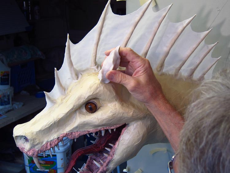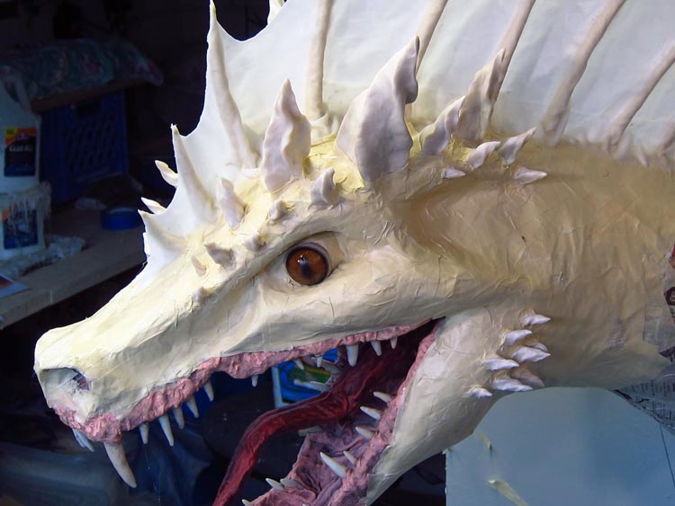 So…. painting. I don’t usually use spray paint, but this project called for it. I masked off the Fimo spikes, the eyes, teeth, and wings, took it into the back yard, and spray painted the back side orange.